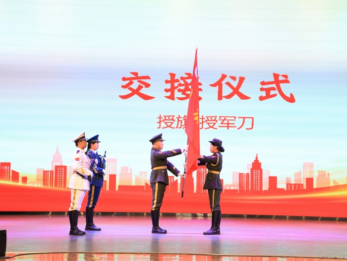 交接大会在雄壮的国歌声中拉开序幕。全体与会人员肃立,齐声高唱《中华人民共和国国歌》。