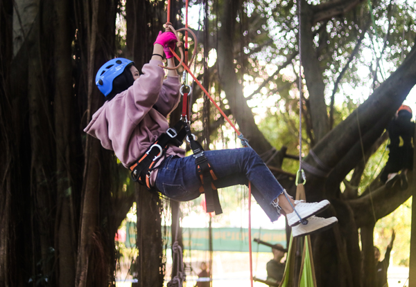 本次活动共设有速度攀爬、枝条行走、扁带行走、树上秋千、上攀体验等五个项目,参与人员在专业技术裁判的规则讲解与技术指导下,正确穿着安全坐带、头盔、护目镜以及手套等保护装备,打好绳结、扣好锁扣,脚蹬绳索,手推绳结,完成上升、下降、行走等动作。