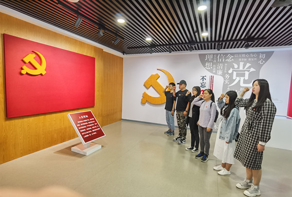 在讲解员的带领下,师生们通过动漫、声光电、VR、触屏互动等技术,体验了“学习强国”挑战答题线下体验区、漫话机关党建、人生如棋、以图为鉴、初心接龙、红色教育VR等多个互动体验环节,共同参观了“机关党建的发展历程”“机关党建的系统工程”“机关党建的生动实践”“机关党建的前进方向”四个板块的内容,观看了漫画机关党建、廖俊波同志的感人故事等。师生们边认真聆听,边驻足观看,在互动场景中寓教于学,深入学习习近平总书记在福建工作期间对机关党建的探索实践,以及中央到地方探索形成的一系列行之有效的机关党建工作机制和方法载体等内容。团学干部中的党员同志在宣誓区面向党旗,整齐列队,举起右拳,重温入党誓词。