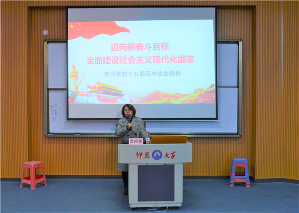 会上,章娇娜立足全会主题,密切结合当今时代实际,从一个主题、两件大事、三条新的逻辑主线、“四个全面”战略布局升级等七个角度出发,围绕“十四五”时期,国家发展的新阶段与新目标、新理念与新部署、新变化与新格局三个方面,对党的十九届五中全会精神进行了系统阐述和深入解读。她指出,党的十九届五中全会的胜利召开是我国全面建成小康社会的巩固期、开启全面建设社会主义现代化国家新征程的起步期的两个期间交汇节点的生动见证,是中华民族伟大复兴史完成伟大跨越的鲜明标志,充分体现了以习近平同志为核心的党中央高瞻远瞩的战略眼光和强烈的历史担当。整场宣讲报告内容丰富,分析透彻,既有政策理论高度,又紧密联系工作实际,对与会的全体师生全面理解、准确把握全会的新思想、新观点、新要求具有很强的指导作用。