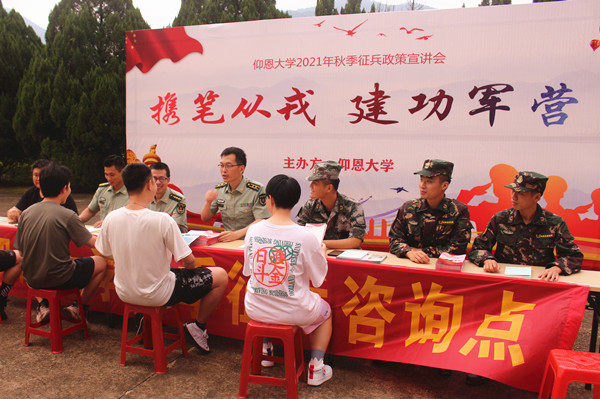 泉州军分区、洛江区武装部征兵一线工作人员系统地介绍了我国的现行兵役制度、今年的征兵政策、应征入伍的基本要求、征兵时间和网上报名流程,详细解读了国家对应征入伍服义务兵役的高校学生的资助、经济补助待遇及考学提干等方面政策,在互动环节对学生的提出的问题进行了逐一回答。