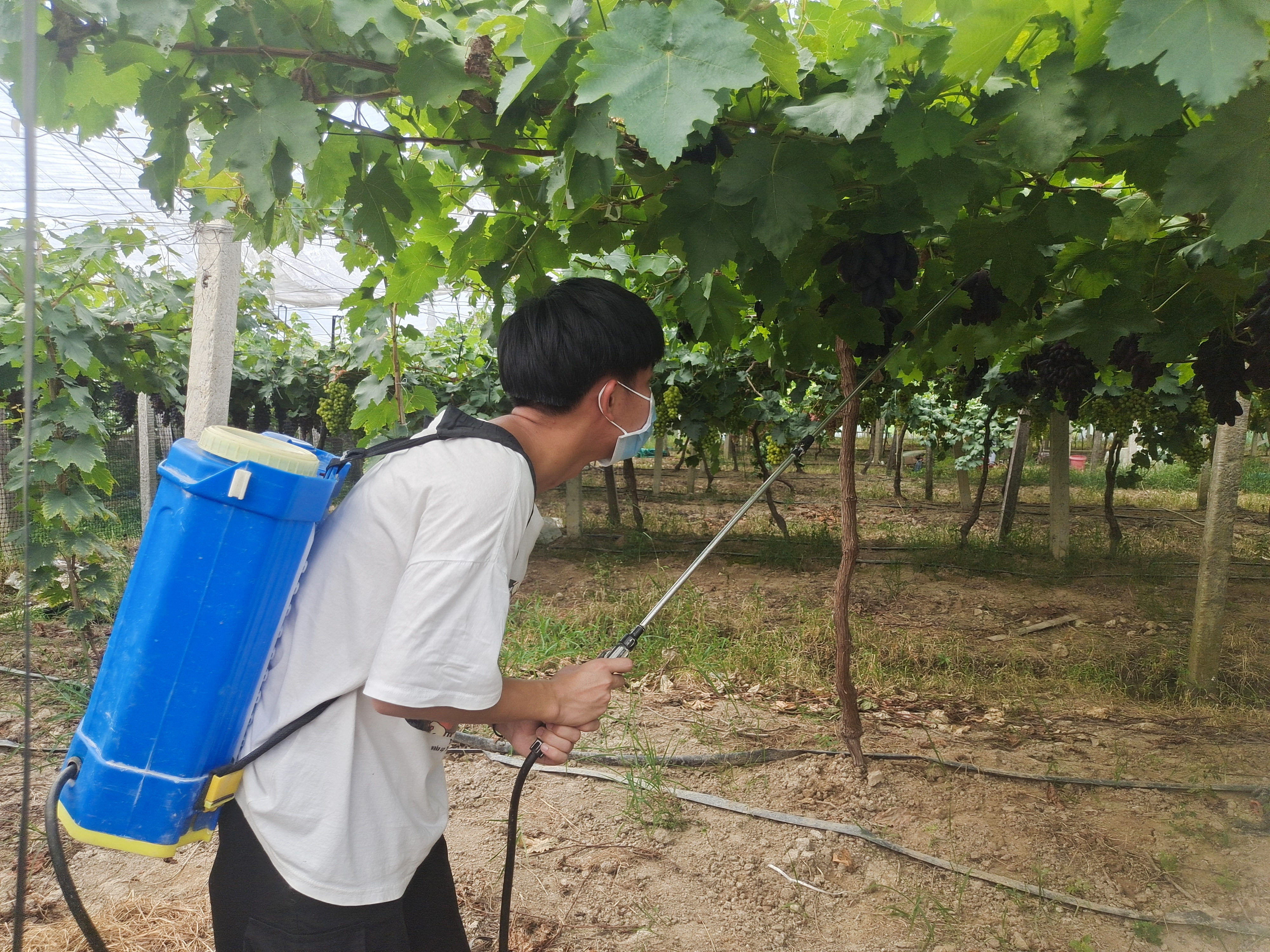 在果农的带领下,队员们走进大棚,拿起剪刀采摘成熟的葡萄,背起喷壶,给还未成熟的葡萄喷洒营养液,了解葡萄种植结构和经验,大家沉浸在丰收的喜悦中,体验到劳动带来的快乐。