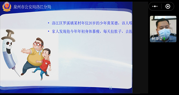 为提升新生识毒、拒毒、防毒的能力,了解毒品危害,自觉远离毒品。9月15日下午,根据疫情防控要求,我校在线上开展2021级新生禁毒宣传教育活动。泉州市公安局洛江分局法制大队警官黄俊锋担任主讲。