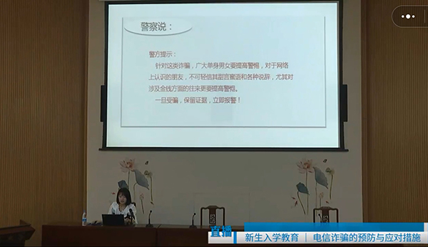 为提升新生防范诈骗意识和能力,9月15日下午,我校在第一教学区多功能报告厅举行线上防诈骗宣传教育,全体新生在企业微信平台观看直播,泉州市公安局洛江分局警官吴雅惠担任主讲。