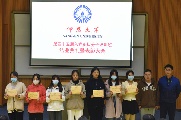 王洋宣读了《关于表彰第四十五期入党积极分子培训班先进班级、优秀学员的通知》,评定法学院学生党支部、外国语学院学生党支部为先进班级,邹雪玲、林逸恒等35名优秀学员。结业仪式上,与会领导向优秀个人和班级颁发了荣誉证书。