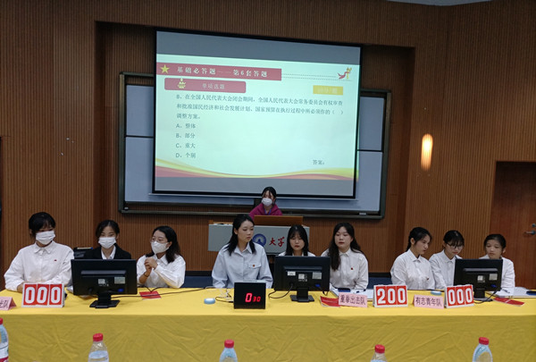 12月15日下午,由校团委主办、法学院团委承办的2021年宪法知识竞赛在第三教学区和昌教学楼海纳讲堂举办。校团委书记杨勤、校团委副书记曹流等到场参加。