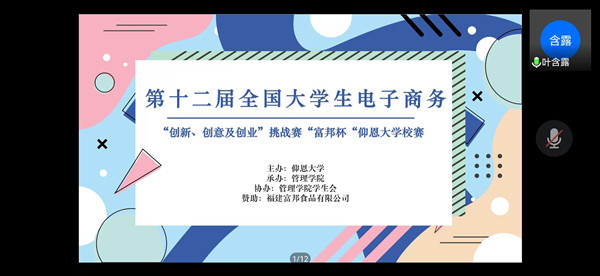 4月9日下午,管理学院在腾讯会议上举办第十二届全国大学生电子商务“创新、创意及创业”挑战赛选拔赛,全校共有15支队伍进入决赛,福建富邦食品有限公司总经理吴妘蓁、顾问刘精忠,管理学院院长翁景德、副院长庄海刚,教务部副主任郑秋莲等担任评委。