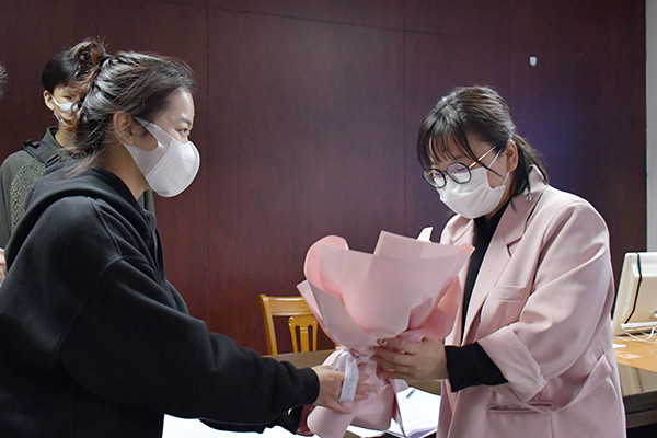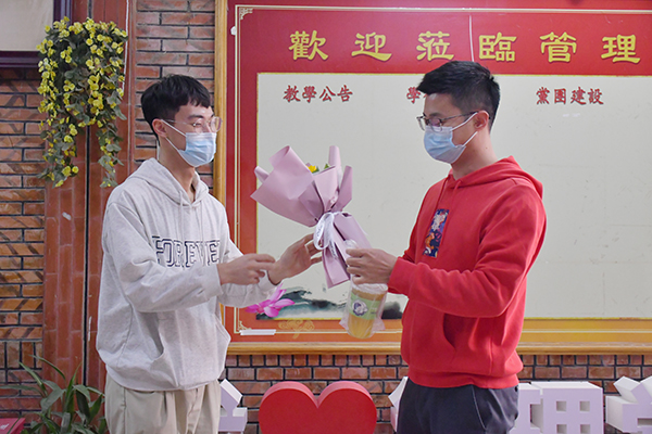 “收到鲜花和奶茶之后非常的惊喜,十分感谢为我们准备这些礼物的同学们。”人文学院辅导员王勇浜在收到鲜花后表示,在疫情防控工作中,面临着许多的挑战,也正是因为身边有学校各部门领导、同事们以及同学们的陪伴与配合,才能够携手共度难关。(侯依依、吴梦凡、王月瑜/文 苏亦轩、林涵悦/图)