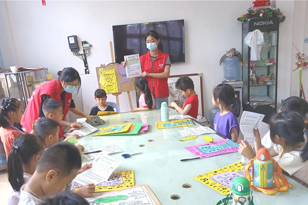 志愿者们向小朋友宣传预防校园欺凌相关知识