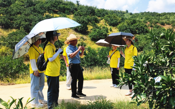 西际村党支部副书记余振远带领队员们深入桔林了解桔林生长情况,讲述党领导下西际蜜桔产业的发展历程,细数近年来蜜桔工作在政策扶持下取得的良好成效。谈话中队员们了解到,几十年前西际经济十分落后,适应西际村黄壤土类的水果少之又少。一代又一代村书记积极响应国家政策,带领村民不断协调环境、资源之间的矛盾,在探索中找到了适合西际地域、气候发展的蜜桔产业,有效地推动西际村经济走向了“富起来”的道路。