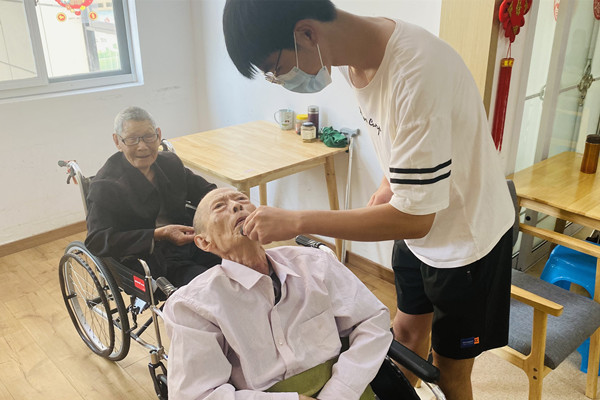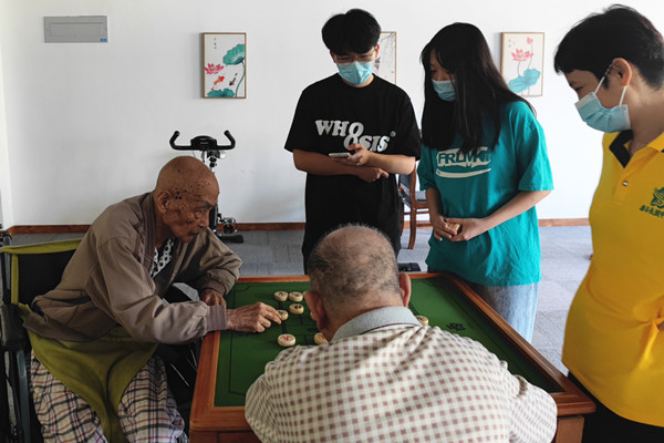 在康寿养老中心,老人们或拉着队员们聊聊家常、说说岁月故事,或与队员们进行象棋“博弈”。实践队员与中心工作人员的交谈,了解到了老人的生活现状及所遇到的困难,他们为老人刮胡子、分配午饭、整理衣物等方式对老人进行了悉心照顾。同时,实践队员积极向老人宣讲防疫知识,告诉他们要勤洗手、多通风,切不可放松警惕。