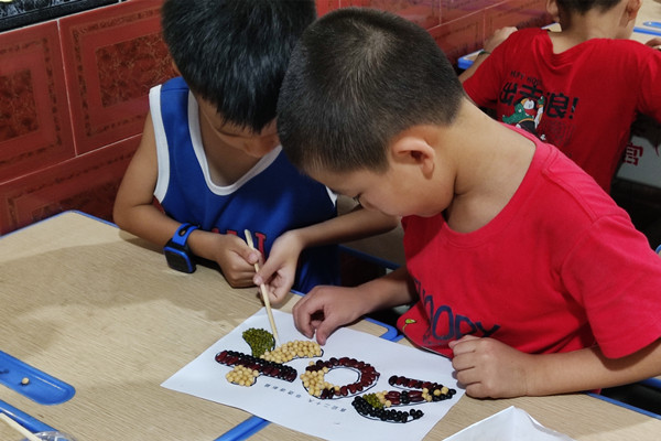 活动开始前,队员们向孩子们简要介绍了五谷画的历史渊源、基本分类和表现形式,让孩子们对五谷画有了初步的了解。孩子们用自己的想象力、创造力和个人的审美能力,在画纸上涂上胶水,放下谷物,拼凑出一幅幅层次分明,颜色绚丽而生动的五谷画。