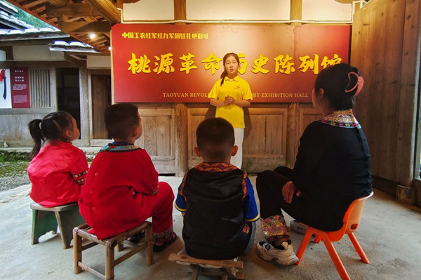 此外,实践队员们担任青年志愿者,为来到村中研学的中小学学生队伍讲述村中的历史故事、红色故事。通过队员们声情并茂的讲述,学生们了解了红军三过桃源村的故事、浮桥头战斗的始末、风水隔七烈士墓的由来。