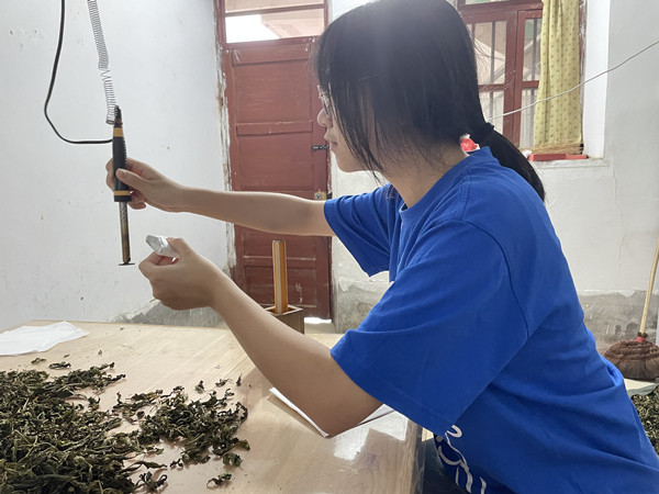 在村民的带领下,实践队员走进制茶室,参观“三杯茶”党建工作室。工作人员向实践队员介绍水仙茶的制作工序,详细讲解种茶、制茶、泡茶、品茶的要点。