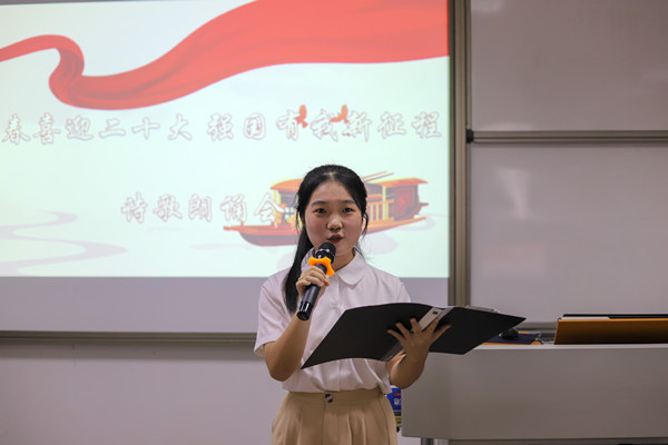 活动现场,师生们用慷慨激昂、精神饱满的朗诵,倾诉着对祖国和中国共产党的感激热爱之情、对民族英雄的崇敬之情,一次次将现场气氛推向高潮。《祖国,我亲爱的祖国》《七律·喜迎二十大》《我为二十大献首歌》等诗词生动诠释在非凡的世纪征途上,中国共产党人带领亿万人民经过千难而百折不挠,历万险而矢志不渝,成就百年大党的恢宏气象。